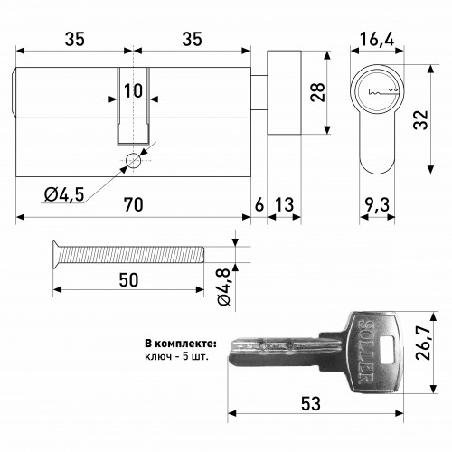Механизм цилиндровый FV5 черный (70мм 5 ключей) кл/вертушка латунь/металл SOLLER /12 120/